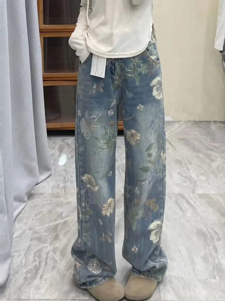 New Chinese Style Print Jeans | Loose Straight-Leg Trousers for Women