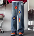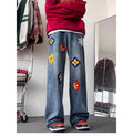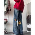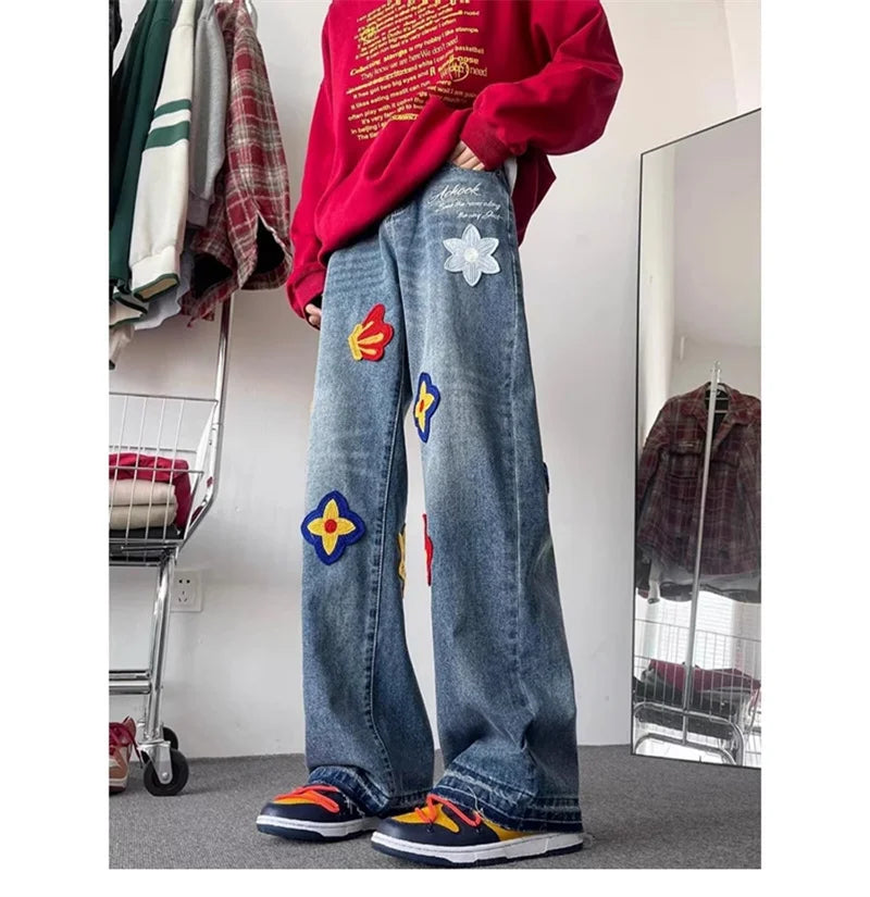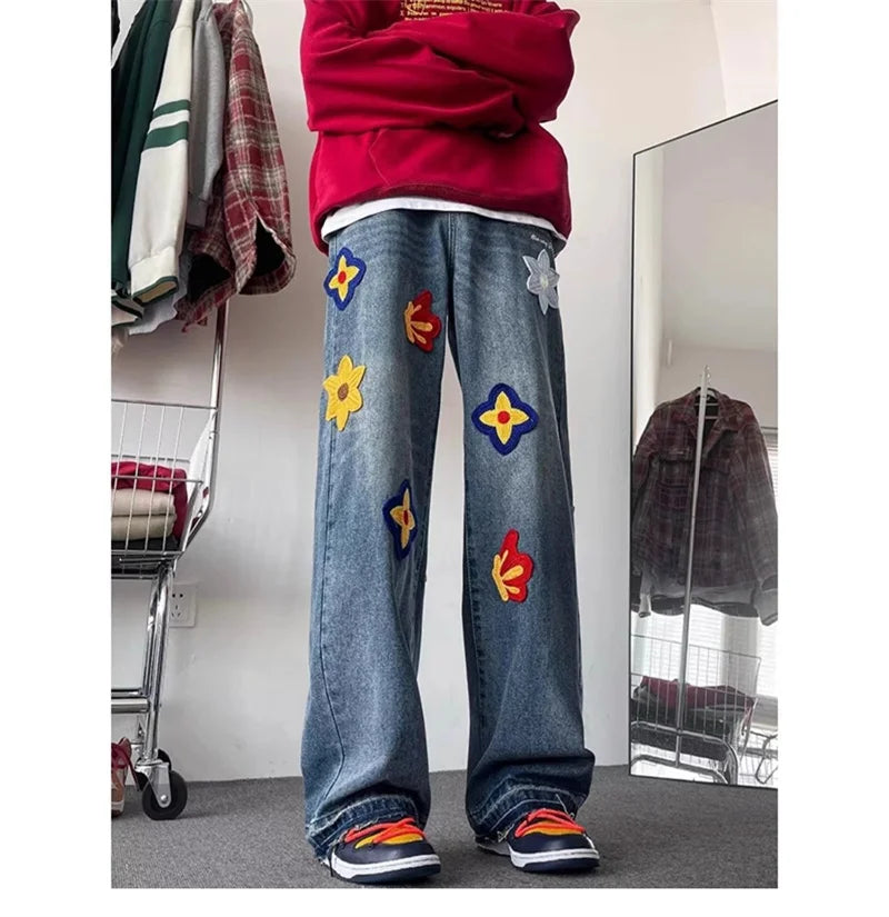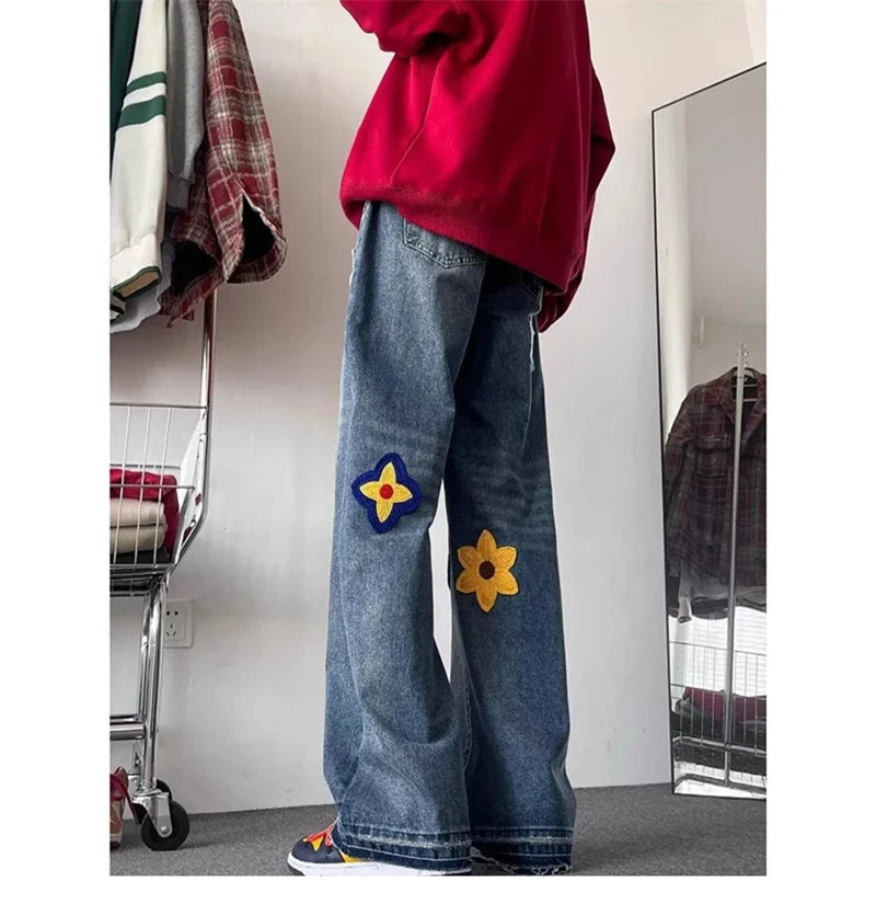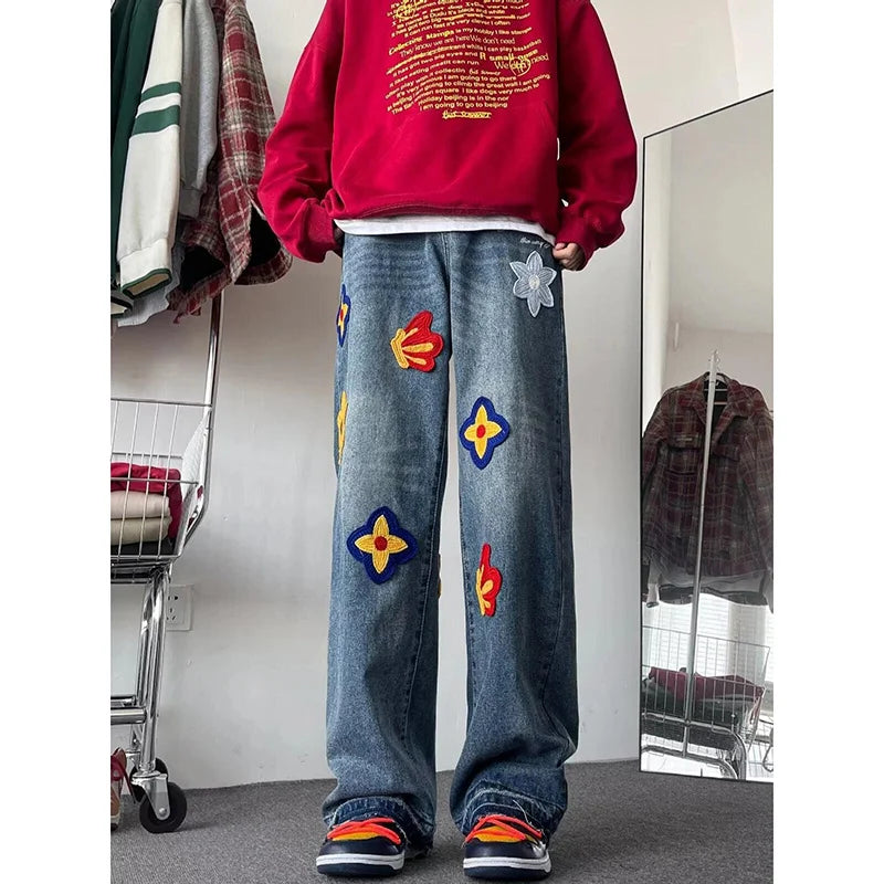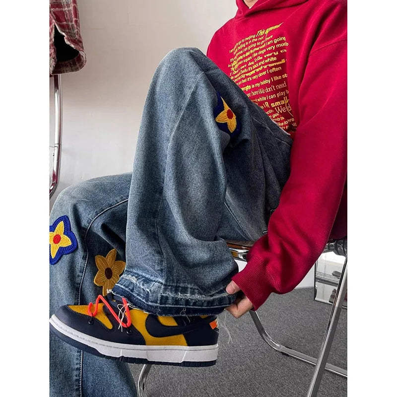 Y2K Vintage Flower Embroidery Jeans for Men | Distressed Baggy Denim Pants