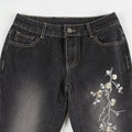 Intricate Floral Embroidery: Beautifully stitched flower patterns wind their way down the legs, adding a soft, feminine touch to the rugged denim texture.